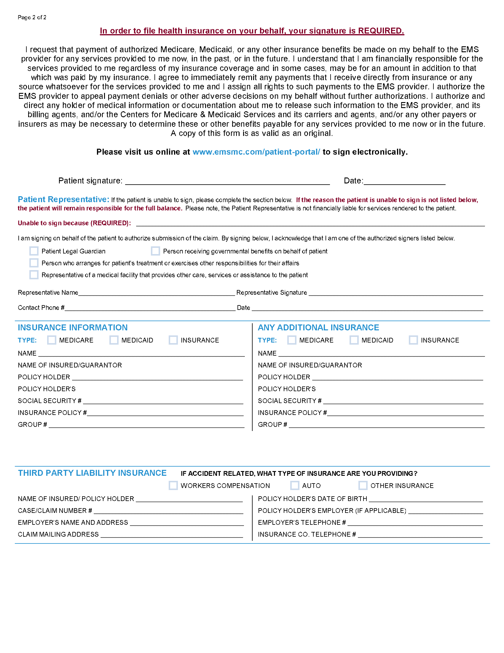 The Frankfort Fire Protection District has partnered with EMSMC, a leader in the medical records and billing industry. Once a party has been transported to the Emergency Department by our staff, a Patient Care Report is created. A copy of this report accompanies the patient at the Emergency Department. A short period later, the Patient Care Report is securely transmitted to EMSMC. They then begin the process of creating an invoice, and contacting the responsible party. This is based upon the information that was provided to our staff at the time of the incident.
